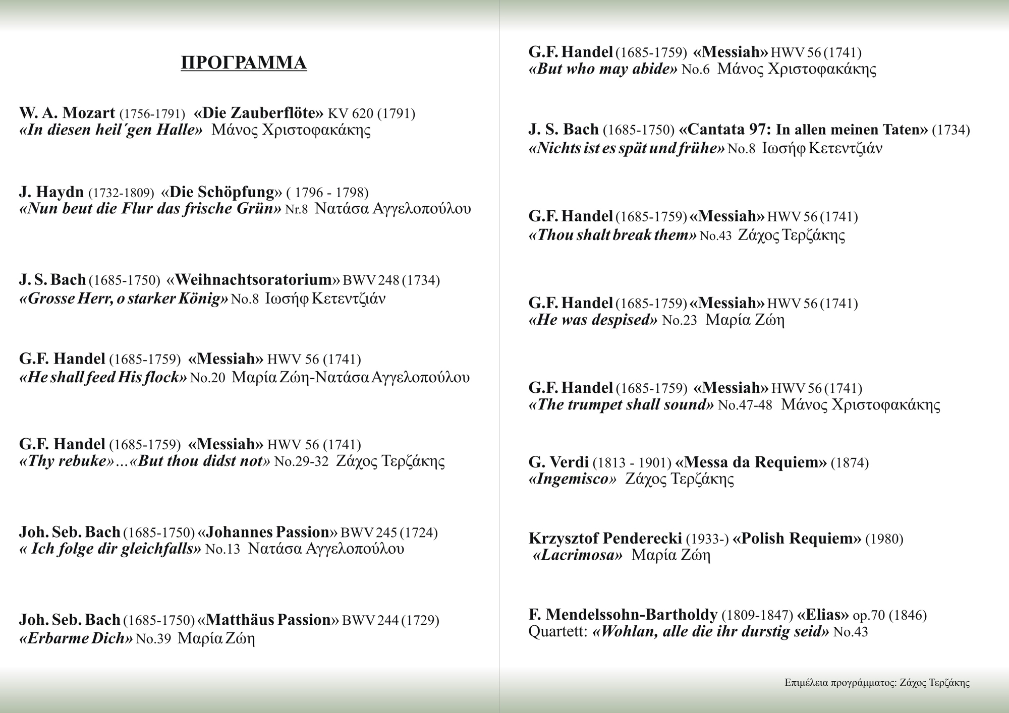 J.S. Bach, G.F. Handel, J.Haydn, F. Mendelssohn, G.Verdi, Kr. Penderecki.