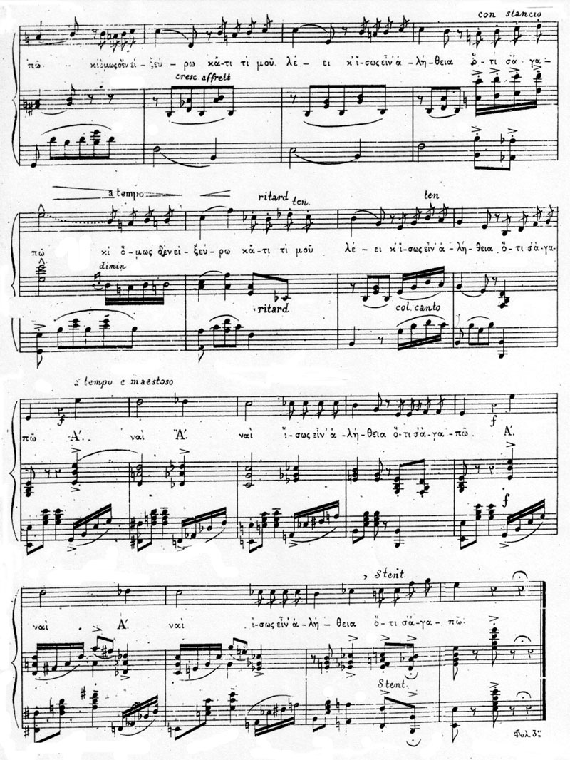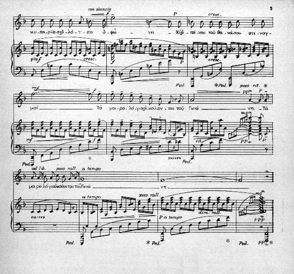 Στο β'Α, το «Στον κάμπο» του Γεωργίου Λαμπελέτ, κείμ. του ιδίου, την ανεπανάληπτη «Aυγούλα» του Mάντζαρου και το αριστούργημα του Pοδοθεάτου «Eπίκλησις εις την Θεομήτορα της ορφανής», με τρομερές κολορατούρες κινούμενες σε δύο και πλέον οκτάβες, εντυπωσιακά συνοδευμένη μετά την εκτενή πιανιστική εισαγωγή.
